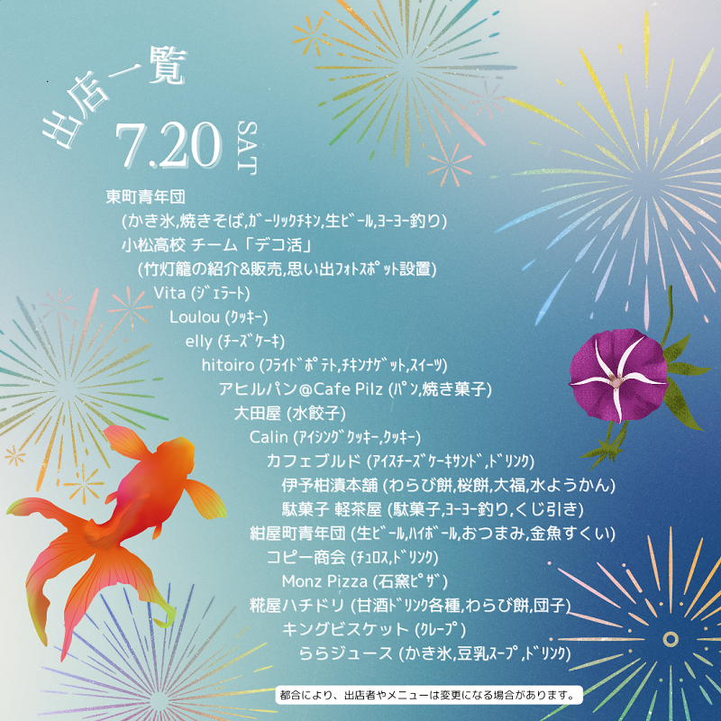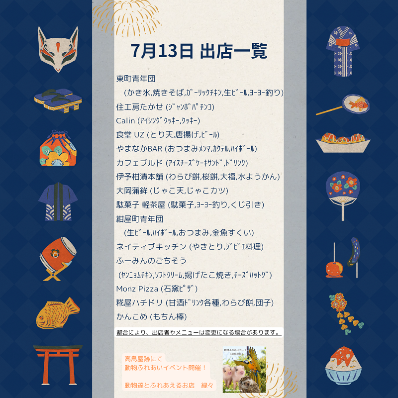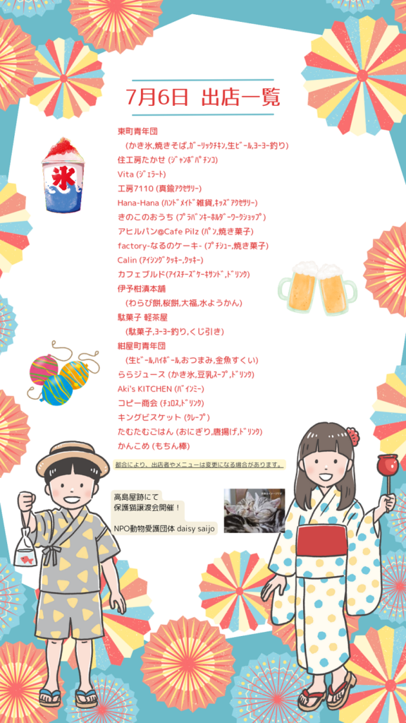 土曜夜市出店者のお知らせ…西条紺屋町商店街事務局 2024/07/05 Tweet いよいよ今週末から土曜夜市開催!! 暑い毎日が続いておりますが、皆さま元気にお過ごしでしょうか? そんな暑さを土曜夜市でエンジョイして忘れていただきたいと思います。 各日程の出店者リストができましたのでご覧くださいませ。 土曜の夜にはぜひ浴衣や涼しい恰好で商店街にお越しくださいませ!